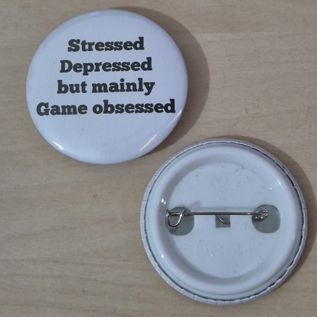 Button with white background and black text 'Stressed Depressed but mainly Game obsessed' for those who are obsessed with gaming. The perfect addition to bags, vests or collections.