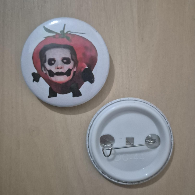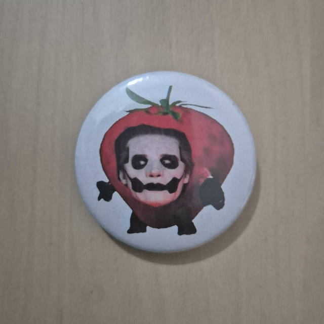Button with Papa IV (Copia) as a strawberry with little legs & arms. Definitely sparks the conversations & will result in laughter. The perfect addition to bags, vests or collections for those who love the band Ghost.