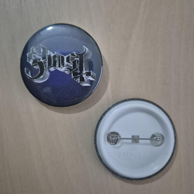 Button with the new black & silver Ghost logo on a purple & black hue background. The perfect addition to bags, vests or collections for those who love the band Ghost.