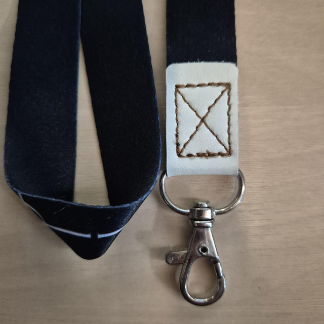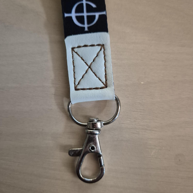 Lanyard with the Grucifix logo from the band Ghost on the outside and neutral black on the inside. Made with Nylon and finished with a light grey faux leather buckle including a lobster claw clasp. Fabric feels very soft and smooth on the skin, can slip around due to the softness & smoothness of the fabric.