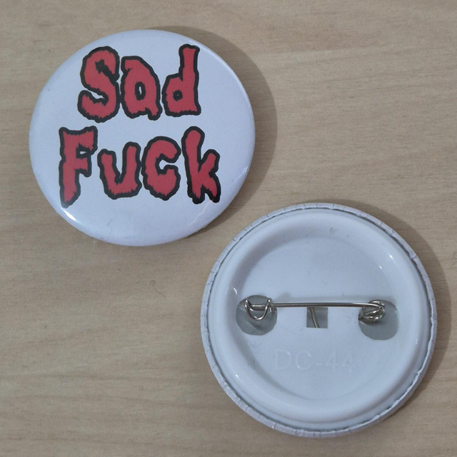 Button inspired by the song Sad Fuck from Ryan Mack. The perfect addition to bags, vests or collections for those who love Ryan Mack or just silly quotes & images. SALE ITEM: NO RESTOCKS!