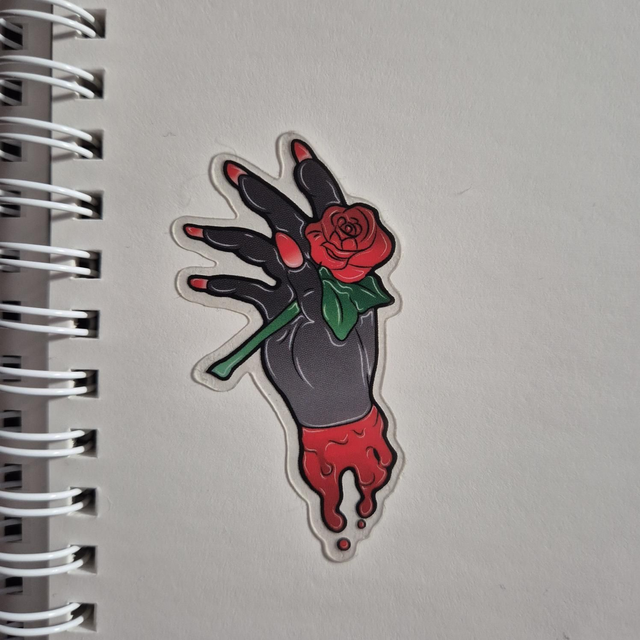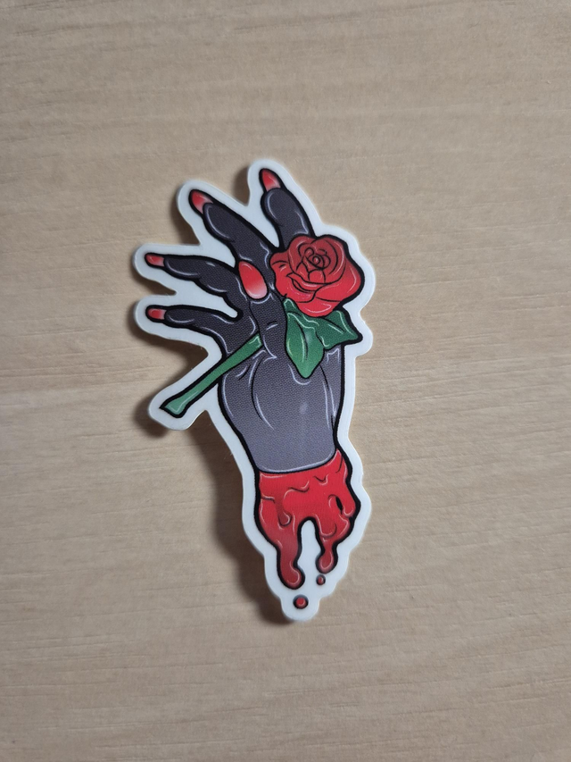Chopped off hand with blood dripping and holding a rose. Sticker is clear so it's perfect to place on any color background. Finished with a glossy topcoat for extra shine. SALE ITEM: NO RESTOCKS!