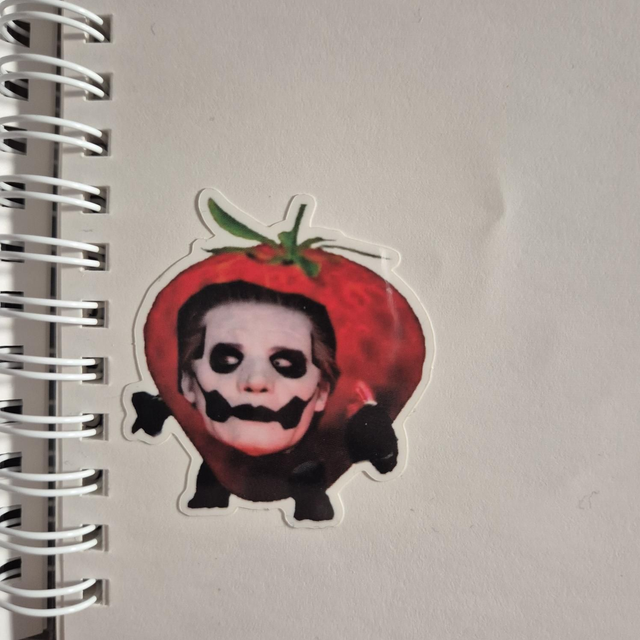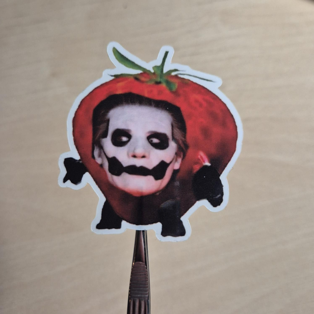 Vinyl sticker inspired by the band Ghost. Face of frontman Papa IV, or Copia, is put on a strawberry for a funny effect. Finished with a glossy topcoat for extra shine.